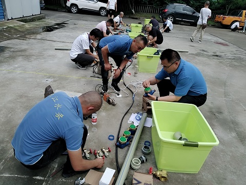 7月20日下午,二水廠維修車間門前,來自市水務公司管網運行部、鄉鎮供水部的11支隊伍22名技能好手,正在緊張進行著搶維修實操比賽:有的正認真識別設計圖;有的正在切割水管,熔合管道;有的已經開始組裝管道、閥門......一個個全神貫注,顧不上汗水模糊了眼睛,浸濕了衣裳。這是公司開展搶維修技能競賽上實際操作環節的一個場景。