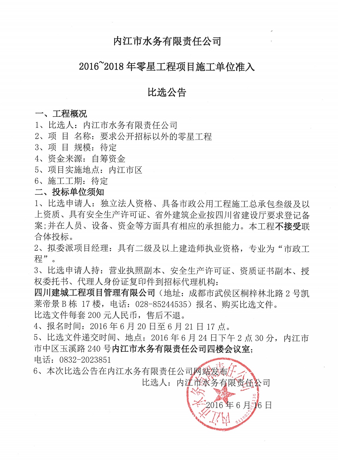 內(nèi)江市水務有限責任公司2016~2018年零星工程項目施工單位準入比選公告