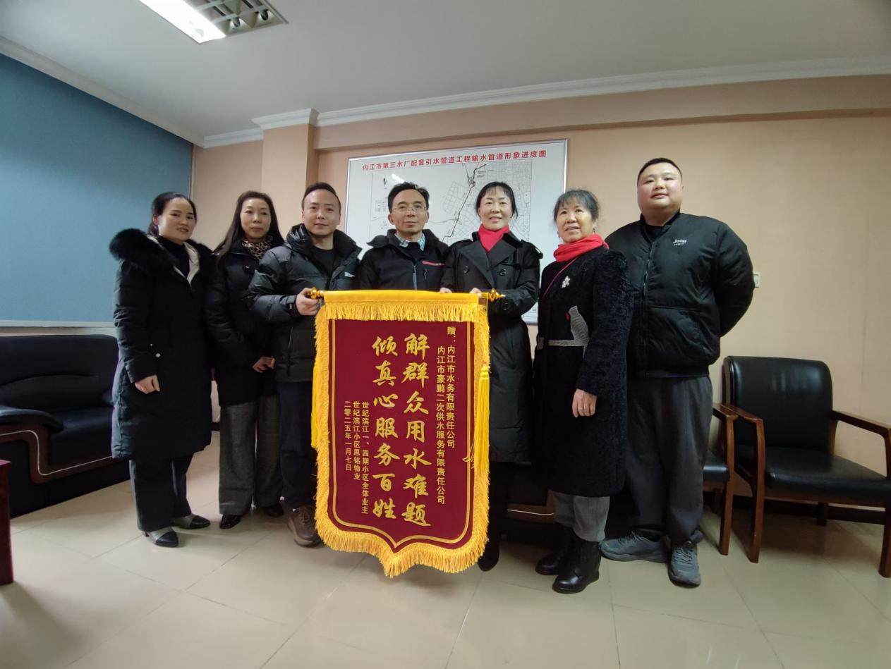 豪鵬二供公司黨支部積極踐行便民舉措、主動作為的舉動,贏得了世紀濱江業委會及物業的高度認可,并送錦旗向豪鵬二供公司表達誠摯的感謝與敬意。