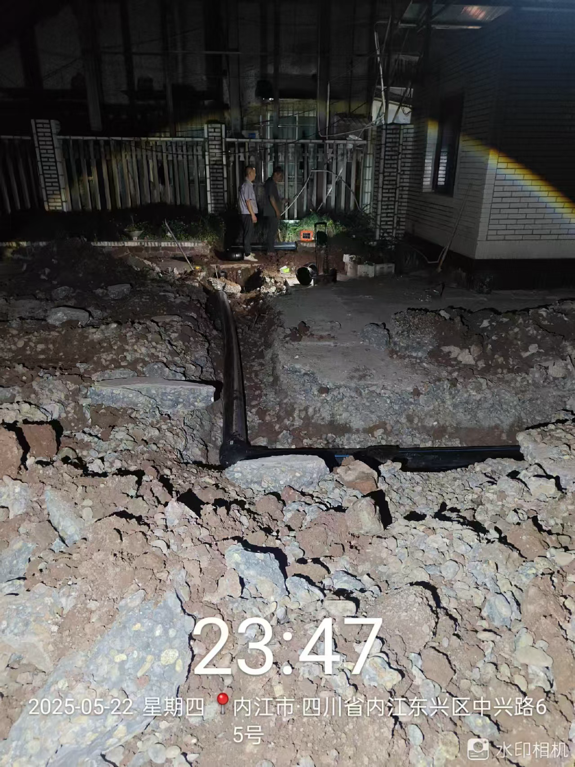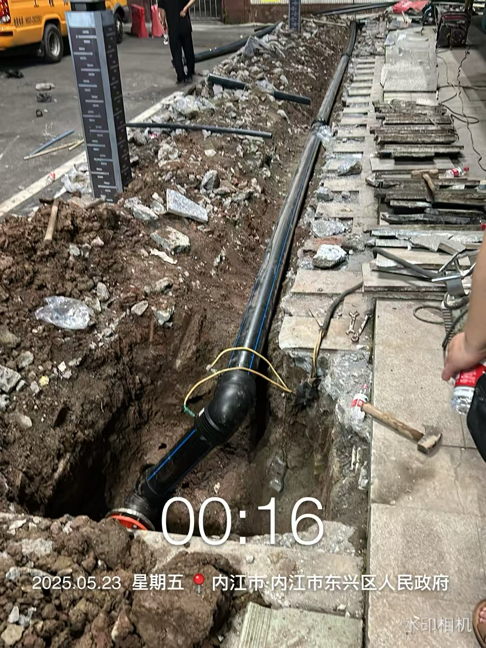 搶修現(xiàn)場(chǎng),維修人員面對(duì)夜間視線不佳、高溫作業(yè)、現(xiàn)場(chǎng)環(huán)境復(fù)雜等多重挑戰(zhàn),爭(zhēng)分奪秒、迎難而上,通宵達(dá)旦開展搶修工作。次日凌晨3點(diǎn)58分,維修人員熊弈在工作群里發(fā)布消息:“東興區(qū)政府DN150鋼管因漏點(diǎn)在建筑下方無法維修,已從旁改管繞過漏點(diǎn),160PE管改管約60米,63PE管改30米,加裝50銅閘閥一只,現(xiàn)已修復(fù)通水。”至此,搶修工作圓滿結(jié)束,恢復(fù)正常供水。